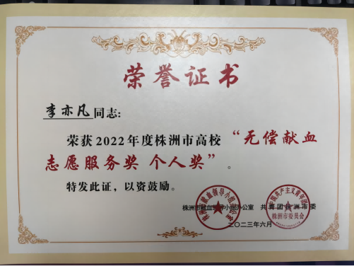 近日,湖南省卫健委、教育厅下发关于2021-2022 年度全省学校无偿献血表现优秀单位和个人的通报,米兰官方端网站登录入口_米兰(中国)荣获湖南省2021-2022 年度组织应急献血优秀单位。根据团株洲市委《关于表彰2022年度株洲市高校无偿献血先进集体和先进个人的决定》(株献办联[2023] 3号)文件,我院团委荣获株洲市2022年高校无偿献血组织奖,我院青年志愿者协会荣获株洲市2022年无偿献血志愿服务团队奖,团委李亦凡老师荣获2022年无偿献血志愿服务个人奖。